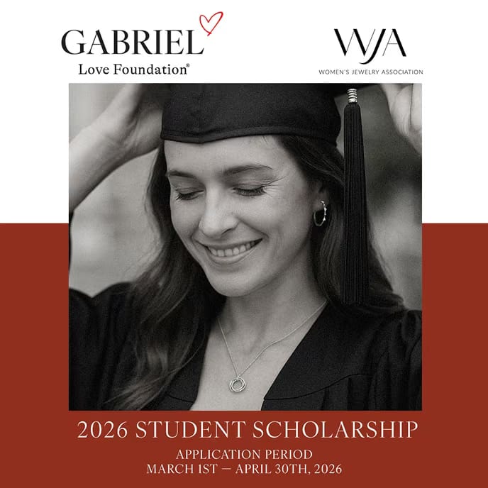 The WJA-Gabriel Love Foundation Student Scholarship in partnership with Gabriel & Co. is a $5,000 scholarship awarded to a deserving female student enrolled in design or non-design courses through a jewelry or metal smithing program at an accredited college, university, or training school.